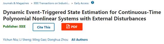 近日,控制科学与工程学院盛立教授团队在连续时间多项式非线性系统的状态估计方面取得新进展,相关研究论文Dynamic Event-Triggered State Estimation for Continuous-Time Polynomial Nonlinear Systems with External Disturbances于IEEE Transactions on Industrial Informatics在线发表。博士生牛艺春为第一作者,盛立、周东华教授为共同通讯作者,中国石油大学(华东)为第一署名单位。