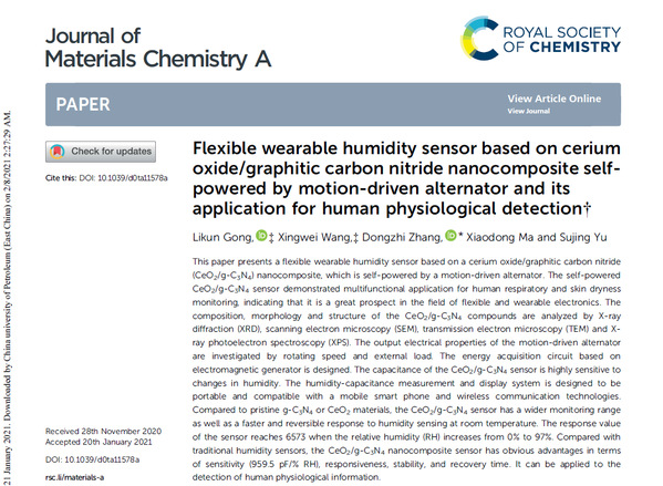【本站讯】近日,我校理学院理科实验班专业2017级本科生宫礼坤的科研成果《运动驱动交流发电机自供电氧化铈/石墨氮化碳纳米复合材料柔性可穿戴湿度传感器及其在人体生理检测中的应用》(Flexible wearable humidity sensor based on cerium oxide/graphitic carbon nitride nanocomposite self-powered by motion-driven alternator and its application for human physiological detection)在线发表在国际知名权威期刊Journal of Materials Chemistry A (SCI影响因子11.301)上。论文是宫礼坤和控制科学与工程学院控制科学与工程专业2019级研究生王兴伟共同第一作者,通讯作者是控制科学与工程学院张冬至教授,中国石油大学(华东)为第一署名单位。该研究得到国家自然科学基金、研究生创新工程基金项目资助。