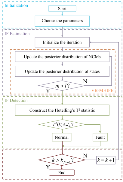 本文针对受不确定协方差噪声干扰的随机非线性系统,研究了间歇故障的估计与检测问题。研究方法首先增广状态与故障,将传统非线性系统转化为奇异系统。针对间歇故障估计问题,基于变分贝叶斯方法引入了一种新的滚动时域估计器。该方法通过合理选择共轭先验分布,实现了对间歇故障和噪声协方差矩阵的同步估计。此外,本文对估计结果的统计特性进行了分析,并基于霍特林统计量构建了间歇故障检测框架。为验证所提方法的有效性,在旋转导向钻井工具系统上进行了大量实验,结果证明了该算法在实际应用中的有效性。