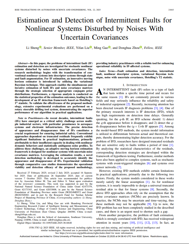 近日,我院控制科学与工程专业盛立教授团队2024级博士研究生刘一凡在非线性系统的间歇故障检测方面取得进展,相关研究成果Estimation and Detection of Intermittent Faults for Nonlinear Systems Disturbed by Noises With Uncertain Covariances发表在《IEEE Transactions on Automation Science and Engineering(TASE)》。《TASE》是自动化与控制领域的国际知名期刊,目前影响因子为6.4SCI二区)。论文第一作者为盛立教授,通讯作者为盛立教授和周东华教授,中国石油大学(华东)为第一署名单位和通讯单位,该研究得到国家自然科学基金、山东省自然科学基金和山东省泰山学者研究基金的资助支持。