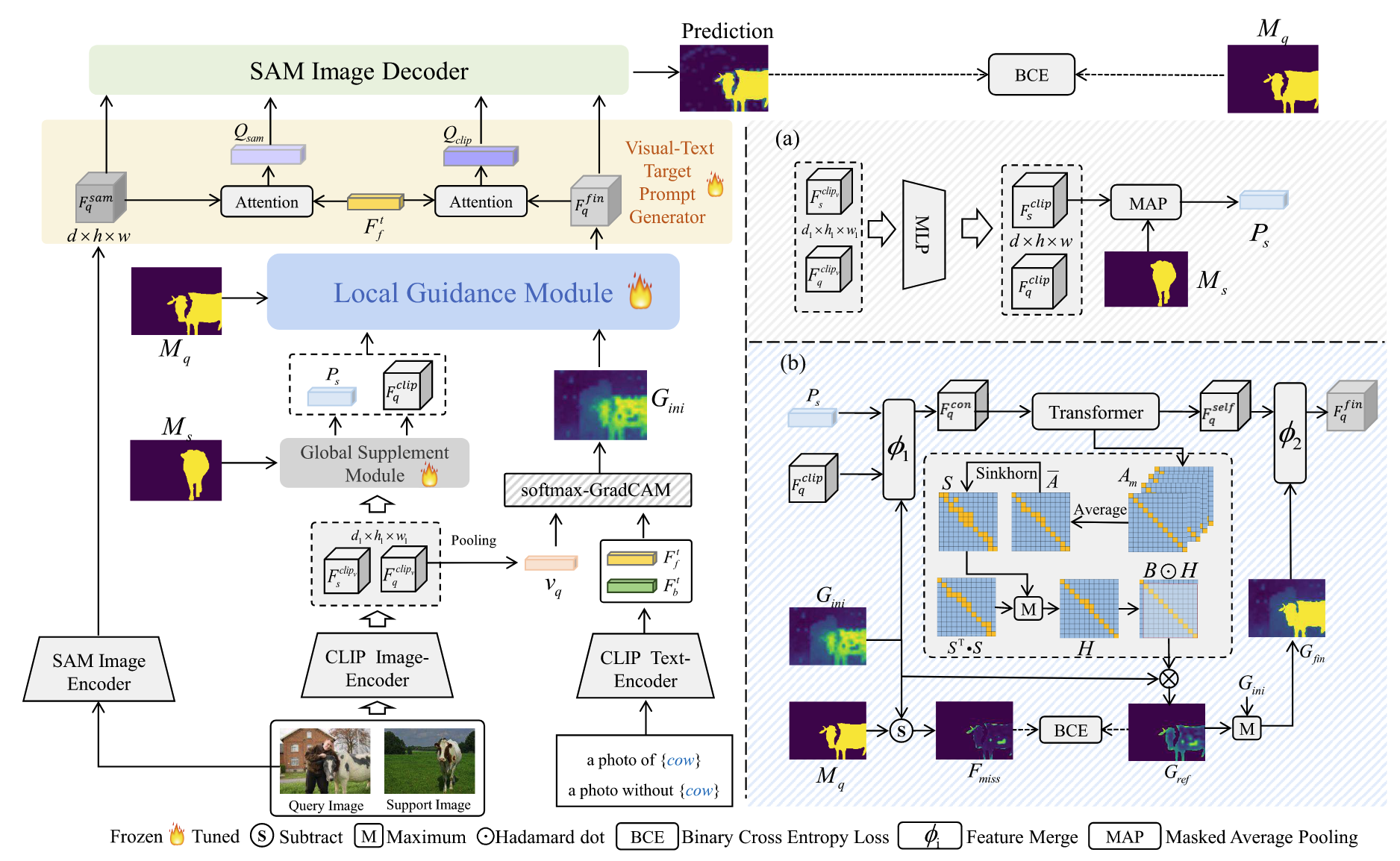 小样本分割(Few-shot Segmentation) 近年来受到了广泛关注。许多最新方法尝试将Segment Anything Model(SAM) 引入该任务。得益于SAM强大的泛化能力与丰富的目标特征提取能力,这一思路在小样本分割中展现出巨大潜力。然而,SAM的解码过程高度依赖于准确且显式的提示(prompt)。这使得现有方法大多专注于从支持集中提取提示信息,但这种方式无法充分激活SAM的泛化能力,并且在适应未知类别时容易导致解码偏差。为此,我们提出了一种与SAM相结合的无偏语义解码策略(Unbiased Semantic Decoding, USD)。该方法同时从支持集与查询集中提取目标信息,并借助CLIP(Contrastive Language-Image Pre-training)模型的语义引导,实现一致的预测结果。具体而言,为增强SAM的无偏语义判别能力,我们设计了两种特征增强策略,利用CLIP的语义对齐能力来丰富原始的SAM特征,首先是全局增强(Global Supplement),在图像层面引入来自支持图像的类别指示信息,以提升模型的泛化能力;其次是局部引导(Local Guidance),在像素层面提供来自查询图像的目标位置信息,以强化局部目标关注。此外,我们还提出了一个可学习的视觉-文本目标提示生成器(Visual-Text Target Prompt Generator),通过目标文本嵌入与CLIP视觉特征的交互,生成以目标为中心的提示嵌入。该方法无需重新训练基础视觉模型,就能通过富含目标语义信息的提示,引导模型关注目标区域,从而提升分割效果。