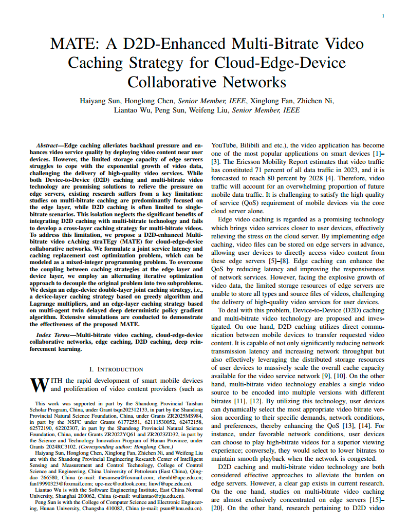 陈鸿龙教授团队在移动边缘计算领域取得重要进展,相关研究成果《MATE: A D2D-Enhanced Multi-Bitrate Video Caching Strategy for Cloud-Edge-Device Collaborative Networks》被国际顶级期刊《IEEE Transactions on Mobile Computing》录用。《IEEE Transactions on Mobile Computing》是计算机网络领域的国际权威期刊,目前影响因子为9.2,为SCI一区Top、CCF A类推荐期刊。论文第一作者为控制科学与工程专业2024级博士研究生孙海洋,通讯作者为陈鸿龙教授,中国石油大学(华东)为第一署名单位和通讯单位,该研究得到国家自然科学基金、山东省泰山学者青年专家项目和山东省自然科学基金等项目的资助。