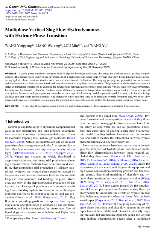 近日,我院海洋结构物设计与评估团队在多相垂直段塞流流体力学方向取得关键进展,相关研究成果Multiphase Vertical Slug Flow Hydrodynamics with Hydrate Phase Transition (具有水合物相变的多相垂直段塞流流体力学)发表于《Journal of Ocean University of China》期刊。《Journal of Ocean University of China》是海洋科学与技术领域领域的国际权威期刊,在2025年中科院分区中位于SCI二区行列。论文第一作者为王阳阳副教授,通讯作者为娄敏教授,中国石油大学(华东)为第一署名单位和唯一通讯单位,该研究得到了国家自然科学基金-青年科学基金项目、青岛市自然科学基金和自主创新科研计划项目(理工科)-领军人才培育基金的联合资助。