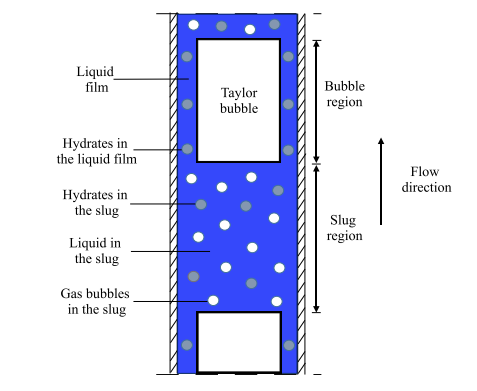 该研究建立了具有水合物相变的三相段塞流模型,这是首次在垂直段塞流模型中显式考虑水合物的情况,探索了水合物的形成和分解如何持续影响垂直段塞流的行为规律,讨论了垂直管内水合物相变与段塞流流体动力学之间的相互作用