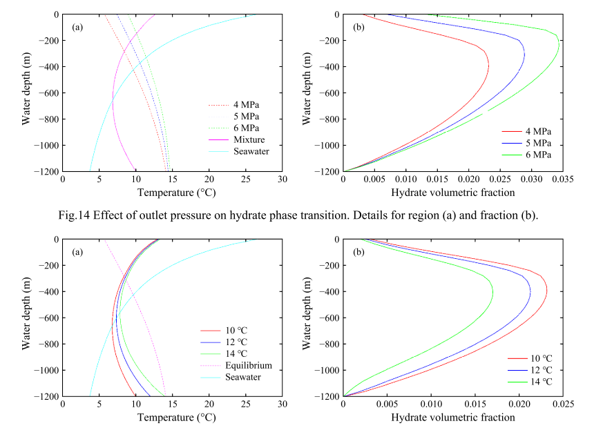 本项研究还预测了不同压力和温度条件下的水合物体积分数。结果表明,水合物的形成和气体的膨胀导致了混合物的表观速度,气液两相分数、液塞中的含气率和单位长度都有减小的趋势。出口压力的增加导致水合物生成速率的增加,这不仅增加了沿管的水合物体积分数,而且使水合物的相变临界点上移。