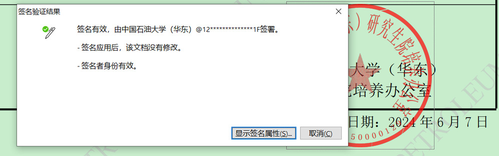 点击电子签名文档内盖章处,或扫描文档右上角二维码,或拖动文件至学校验签网址(https://esign.upc.edu.cn/verifier)指定区域即可验签,验证结果真伪。如下图: