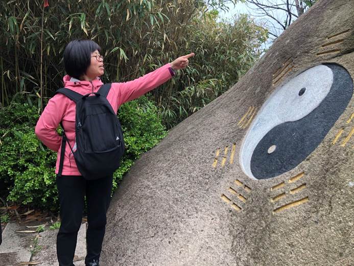 与逼真宫山门相对的,是太极八卦图石刻,马丽丽老师为营员们讲解了太极八卦图的基本释义,它以同圆内的圆心为界,画出相等的两个阴阳鱼,阴鱼用黑色,阳鱼用白色,阳鱼的头部有个阴眼,阴鱼的头部有个阳眼,表示万物都在相互转化,相互联系。
