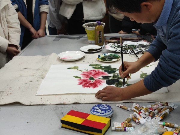 趁同学们兴味盎然之际,王老师挥笔泼墨,现场为我们展示了牡丹的具体画法,笔墨丹青,栩栩如生,体现出国画独具特色的魅力。王老师强调,笔墨是国画的精髓,要通过浓淡、干湿、疏密表现出节奏感和气韵感,展现国画独有的意境。