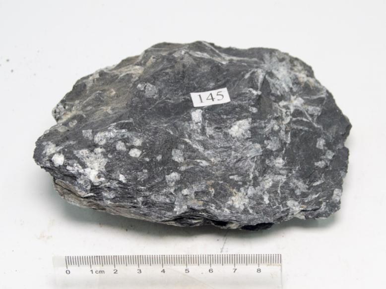 灰色,细粒斑状变晶结构,块状构造,基质角岩结构,主要矿物:红柱石,粘土矿物,石英,角闪石,含炭质。 |