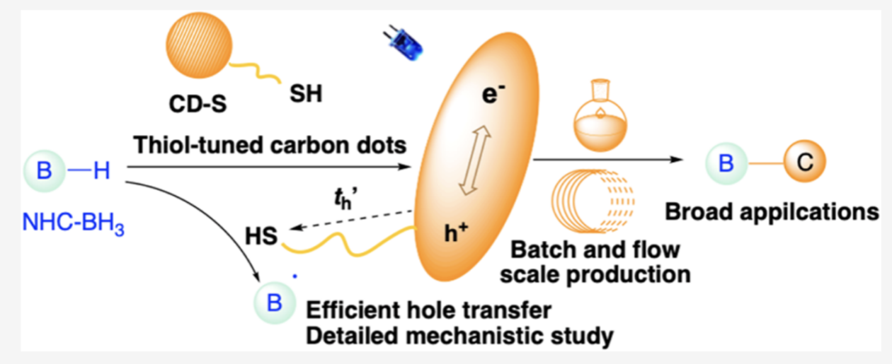 针对上述问题,吴明铂、徐文刚提出分子水平表面修饰策略:在CDs表面共价锚定巯基(–SH),构建 “双功能、准均相”光催化体系。该设计可在光照下快速将空穴转移至表面位点,避免电荷复合并生成硫自由基,进而通过氢原子转移(HAT)促进NHC–BH₃活化,高效生成硼基自由基。该体系在低催化剂用量下即可推动硼氢化与脱氟硼化反应,适用于萘、吲哚、烯烃及多氟芳烃等多类底物,表现出优异效率和选择性。该策略在克级间歇反应与连续流体系中均展现良好稳定性和可扩展性,突显其在有机硼化物大规模合成中的应用潜力。