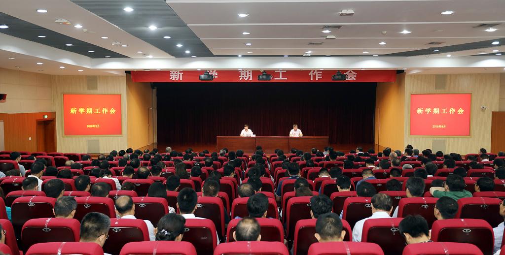 【本站讯】9月12日,学校召开新学期工作会,部署新学期各项工作。党委书记王勇主持会议并讲话;校长郝芳总结上半年工作主要进展,部署下半年重点工作,并就如何改进工作作风提出要求。会议大力倡导担当精神、进取精神和奉献精神,号召全体教职工做学校事业发展的坚定者、奋斗者和实干家。