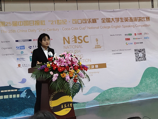 此次比赛由中国日报社、可口可乐大中华区联合主办,由21世纪英语教育传媒和青岛大学承办。比赛主题为“No person is an island”,分为即兴演讲、定题演讲、现场问答等环节。来自全省高校的28位选手,经过前期多轮淘汰选拔进入最后决赛;决赛场面气氛热烈、精彩纷呈,展示了当代大学生较高的英语演讲和跨文化沟通能力。我院英语专业李盈英同学表现出众,斩获佳绩,展示了我院英语教育教学改革的成效和教学发展水平,为进一步强化质量工程建设,提升外语人才培养质量提供了有益借鉴。