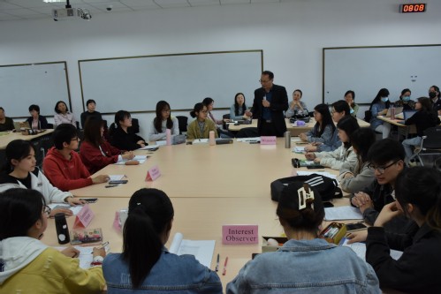 观摩课开始前,王新博教授首先欢迎并感谢张教授亲临教学一线传经送宝,介绍了张文忠教授在南开大学开设个性化教学情况。随后张文忠教授和英语1901班全体同学共同配合,展示了“八·五五”个性化教学模式的具体实施步骤和环节。在两轮小组展示中,同学们分别扮演executive monitor,host, learning mate, time manager, presenter, interest observer, commentator/Q master等角色,就各自研究话题展开讨论、分享、提问、交流、点评等,整个过程“做学用”合一,各教学环节环环相扣、和谐有序。小组汇报结束后,张教授对每位学生的表现做精彩点评。张教授通过创造轻松和谐的课堂气氛激发学习兴趣,运用启发式教学鼓励同学们积极参与课堂教学,让同学们深受启迪,收获颇丰。