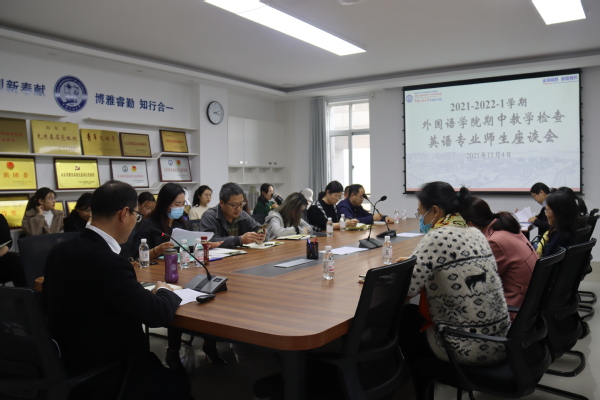 11月4日下午,外国语学院于文理楼346举行2021-2022-1学期期中检查师生座谈会。会议由外国语学院副院长张建科副教授主持,外国语学院各系部负责人、骨干教师、辅导员、教学秘书参加。此次座谈,学院采取了分期分批的方式,分别听取了英语专业、俄语专业、公共课及选修课学生代表的意见和反馈。