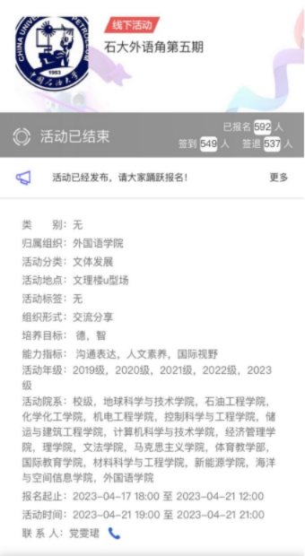 On the evening of April21st,2023,the fifth edition of the “UPCEnglish Corner” and “UPCFrench Corner” wassuccessfully held at the U-shapedplazaandRoom346 of the Arts and Sciences Building, respectively.Organized by the Department of English Language and Literature, the Department of Russian Language,the SFS GeneralOffice and the Youth League Committeeof SFS, and hosted byClass2203of English majorandClass298of French major, the themeswere“How can college students benefit from volunteering?”for“UPC English Corner”and “Specialties of FrenchFestivals”for“UPC French Corner”. The hosts and hostesses for English Corner andFrenchCorner includedDing Zihang, agraduatestudent majoring in English Interpreting,Li Yufeifrom Class 2203of English major,Zhao HongleiandTan JiangmeifromFrenchoptional course.Teachers fromDepartment of English Language and Literature and Department of Russian Language and Literature, as well as English foreign teachers Neville and Steven served as tutors.More than 600 attended thisactivity, includingstudents and teachers fromdiversemajors and international students from Russia, Mexico and Africa, as well asstafffrom the Foreign Affairs Service Centre of the West Coast New Area,etc.