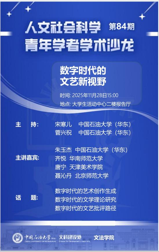 2025年11月28日下午,人文社会科学第84期青年学者学术沙龙暨大学生文化艺术节40周年系列活动在大学生活动中心二楼报告厅成功举办。本次活动由文法学院美术系讲师宋寒儿主持,参与学术报告的青年学者有:中国石油大学(华东)马克思主义学院讲师朱玉杰、华南师范大学特聘副研究员齐悦、天津美术学院讲师唐宁及北京师范大学博士研究生聂沁丹。文法学院美术系讲师菅兴祝以及文法学院中文系讲师李纯泽担任特邀点评嘉宾。本次青年学者学术沙龙聚焦数字时代的文艺创新与学术探索,汇聚艺术学与文学等多学科领域的青年学者,就前沿命题进行跨学科交流与对话,展示出数字时代文艺研究范式的无限可能。