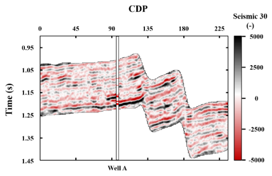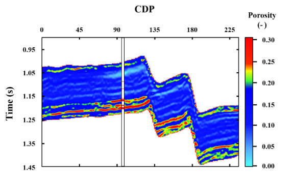 在实际工区数据测试中,我们从中国东部的一个高孔隙度砂岩储层中选取了一个过间剖面来进行实际地震数据的反演。图2展示了在工区内以四个不同入射角度(分别为 12 度、21 度、25 度和 30 度)获取的过井A的地震剖面。该剖面中,有两个主要的高孔隙度含油砂体储层,它们在解释中的红色位置与井 A 相交。