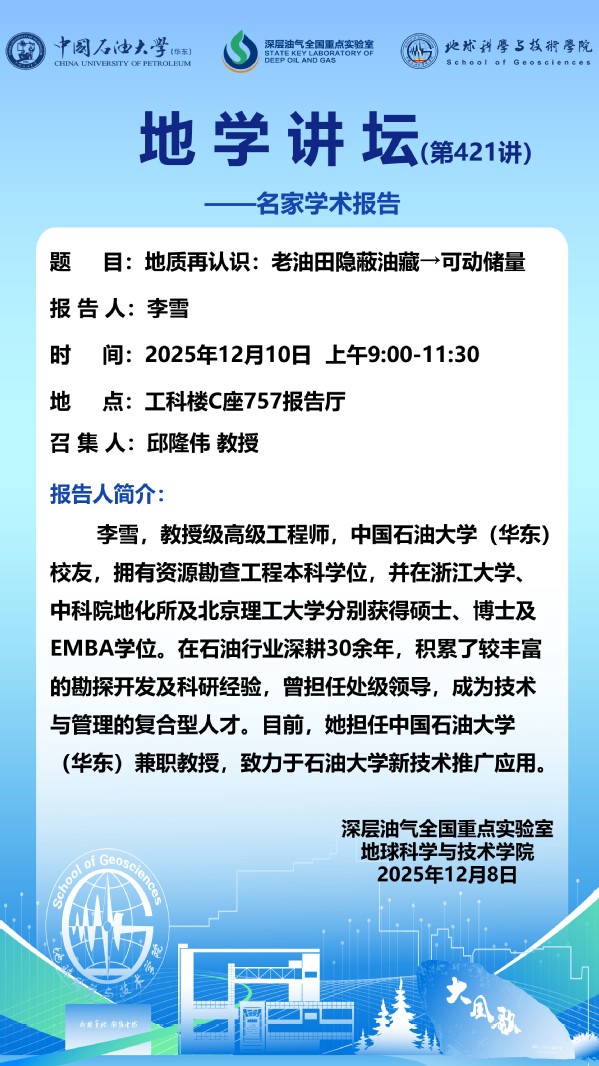 关于李雪教授级高级工程师《地质再认识:老油田隐蔽油藏→可动储量》学术报告的通知