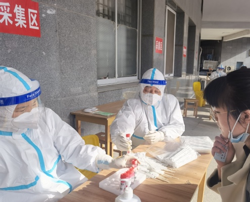 (3月24日我院教师党员周国瑞老师、宋霞老师作为志愿者,在抗疫一线进行核酸检测工作)