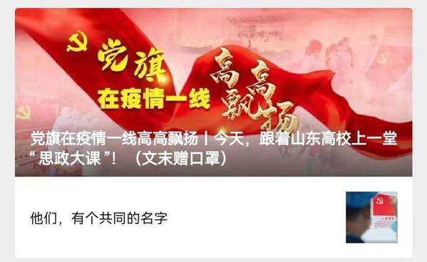 自疫情开始以来,我院师生党员积极参加志愿服务活动的事迹得到了来自各级单位的关注与鼓励。从青春石大的《请组织批准!》,到山东教育发布的《这个春天,我们同上一堂“思政大课”》再到灯塔党建在线的《今天,我们跟着山东高校同上一堂“思政大课》。他们用着文字和图片记录了马院同志们的面对疫情时的一次次挺身而出。