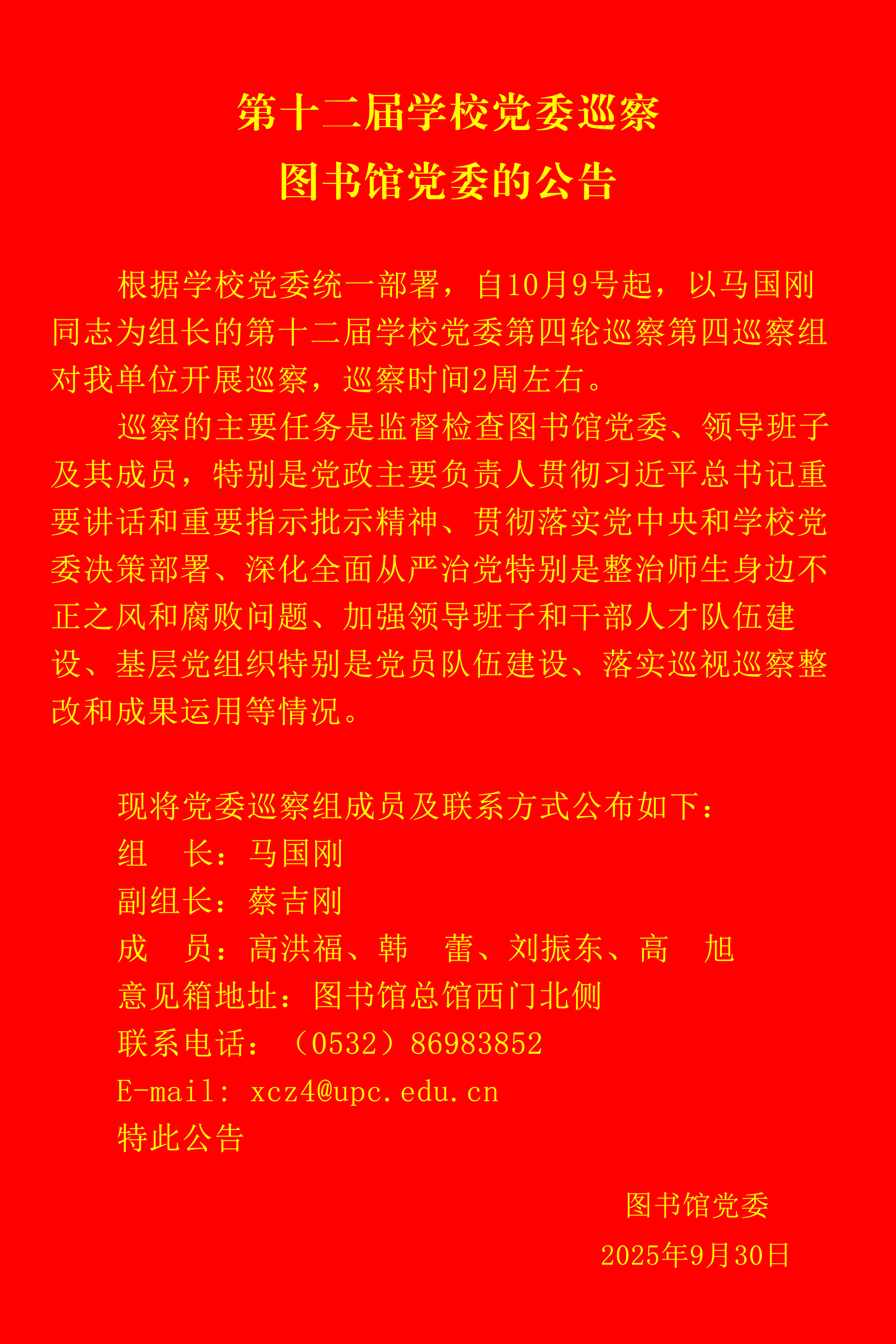 第十二届学校党委巡察图书馆党委的公告