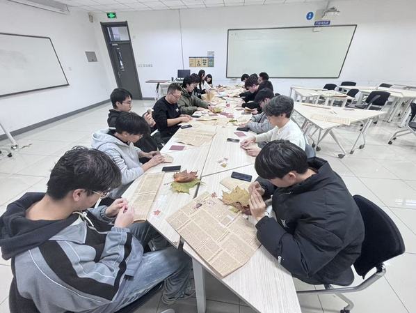 活动伊始,支部成员首先将前期在校园内精心收集的冬季落叶进行创意加工,制作成独具特色的自然书签。金黄的银杏、火红的枫叶在大家的巧手下被赋予新的生命,这一过程不仅让成员感受到变废为宝的劳动乐趣,更在细微处体悟到四季馈赠与自然之美,为感恩之心奠定了自然与生活的基调。
