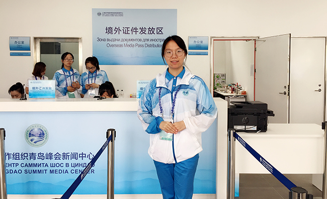 在新闻发布厅工作的曹亚楠每天都要模拟新闻发布会的场景:引领记者签到、领取同声传译设备、引导记者进入座位区、适时递上话筒、用标准流利的俄语播报发布会注意事项……这样的演练每天都要进行10次甚至更多。“我认为自己非常幸运,今年5月份有幸作为中国学生代表赴俄罗斯参加上合组织青年高峰论坛,作为参会者就上合组织成员国之间的文化、教育、社会发展等进行交流。而现在,作为上合组织青岛峰会的一名志愿者,我每天都会尽可能多的练习,嘴角微笑弧度、身体15度前倾、俄语语音语调,这都是我每天的必修课。我希望通过自己扎实的俄语翻译和高标准的服务,让世界爱上青岛这座美丽的城市。”曹亚楠信心满满地说道。