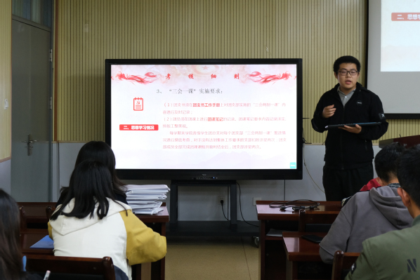 会议伊始,孙林就本次培训大会主要内容做以简述,并对19级新团支书表示热烈欢迎。随后,由李旺展开培训会主要内容——团支书考核准则。李旺表示,准则是为了方便管理,便于对团支书及其所在支部的考核,团支书应注意共青团三会两制一课的主题思想学习,班级的团日活动的有效开展和第二课堂的运用。他希望通过准则可以让团支书更好的严格要求自己,以身作则。刘可扬则就团支书主持举办的团日活动进行具体说明。团日活动的举办意义甚大,其可以增强班级凝聚力和团支部活力,增加经验,引领青年思想。团日活动可以有开会,参观学习和志愿服务等多种形式,但需注意要主题明确,有教育意义,并树立团支部形象。重要的是,活动举办不可失其原则,符合社会主义价值观,符合时代主旋律,调动同学们的积极性,同时也要充分体现民主原则与创新精神。最后,王坤琦就第二课堂——石光的用法展开详述。
